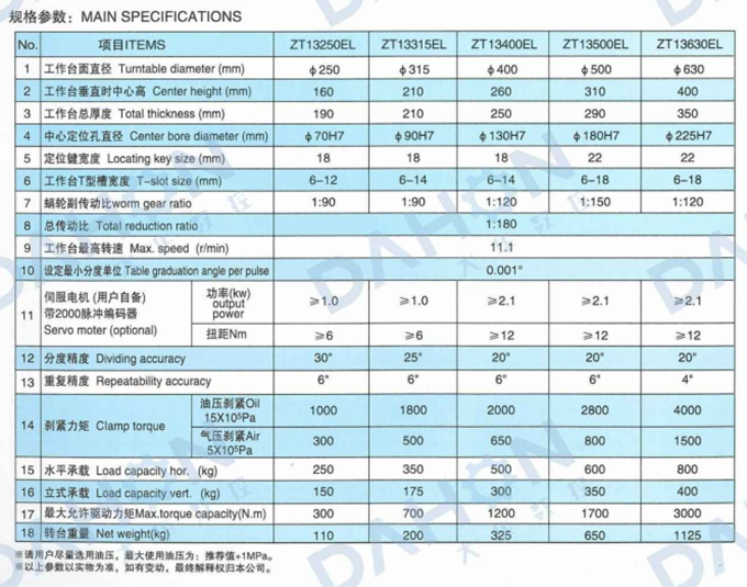 第四軸是各類數(shù)控鏜、銑床和加工中心的關(guān)鍵配套附件,可以主軸垂直和水平兩種方式安裝在主機(jī)工作臺(tái)上,用作主機(jī)的第四回轉(zhuǎn)軸。轉(zhuǎn)臺(tái)在主機(jī)相關(guān)控制系統(tǒng)控制下, 可實(shí)現(xiàn)等分的和不等分的孔、槽或者連續(xù)特殊曲面的加工,且保證很高的加工精度。 ZT 13E series Hor /vert NC rotary table can carry out the performance of direct and indirect dividing plate proc essing, plateslotting and various cam-curving